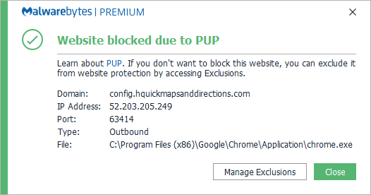 Malwarebytes blocks the domain hquickmapsanddirections.com